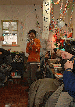 森田氏の机の周りがジブリの伝統に乗っ取り、一杯の飾り物で埋め尽くされる。出社と同時に出産おめでとう色紙が手渡され、演助鶴岡氏の買ってきたクラッカーが打ちならされる。二度目とはいえ森田氏はとてもうれしそう。