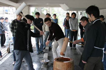 餅つき大会を翌日に控え、制作で準備を進める。まずは買出しなのだが、トッピングにする"きな粉"や"あんこ"などとともに、前回好評だった"納豆"を買おうと思ったのだが、某テレビ番組でダイエット食として紹介されたために、近くの店では品切れになっていて買うことが出来ない!そこで、制作伊藤くんの指示の下、慎太郎、三吉の若手スタッフが手分けして、各地に納豆を15パックを買いに行くことに。結果、無事購入できたのは良かったのだが、15パックの解釈を間違えて3パック入りのセットを15セット、ということは45パックも揃ってしまう。これを見た伊藤くんは、「これじゃ番組に踊らされたみたいじゃないか」と呆れてつぶやく。近隣の方々には本当にご迷惑をおかけしました。決して買い占めるつもりではなかったのであしからず・・・。その後、米を洗い水に浸したり、臼に水を張ったりと、結構準備にも時間がかかるもの、餅つきも。