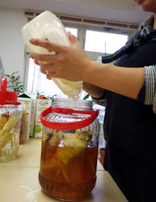 オモニ・キタムラさんと嫁・A子でがんばってハチミツ漬けと焼酎漬けを作成。今漬けておけば制作のみんなが疲れてきたころに振舞えるはず。